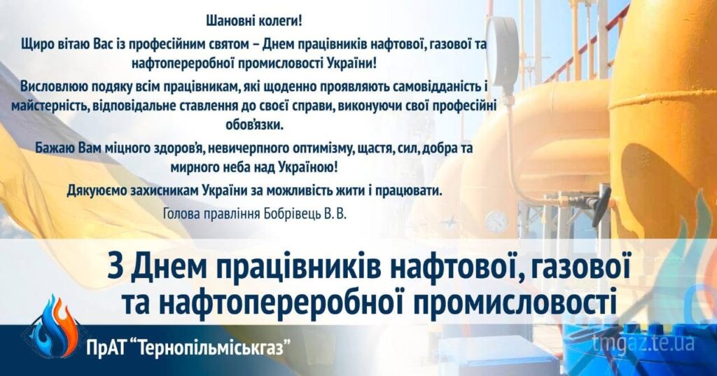 Шановні колеги! Щиро вітаю Вас із професійним святом – Днем працівників нафтової, газової та нафтопереробної промисловості України!